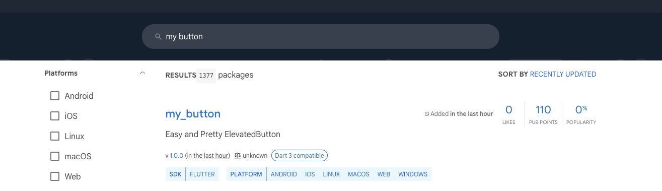 첫 배포시에는 올라가는데 시간이 좀 걸리는거 같다. 한 10분정도 기다렸다가 검색하니 검색에 잘 걸리지는 않았지만(이건 pub.dev측에서 좀 검색부분에 대해 고쳐야한다고 생각한다!) 정렬을 오늘 올라온 패키지로 하니까 내가 올린 패키지가 검색에 걸렸다.